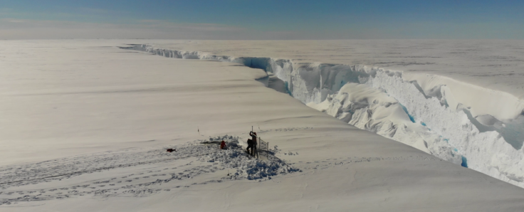 Glaciologists installing monitoring equipment close to Chasm-1 on the Brunt Ice Shelf