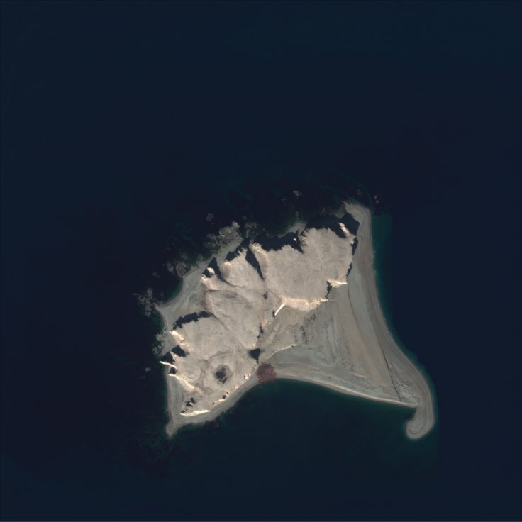 Example of a satellite image of an Atlantic walrus haul-out. From space they look like small or large groups of reddish or pale brown shapes that can be next to each other or a few meters away. This satellite image is 1.87 km². On the Walrus from Space platform (the Geohive app) users will view images cropped to 0.04 km². Satellite imagery © 2021 Maxar Technologies