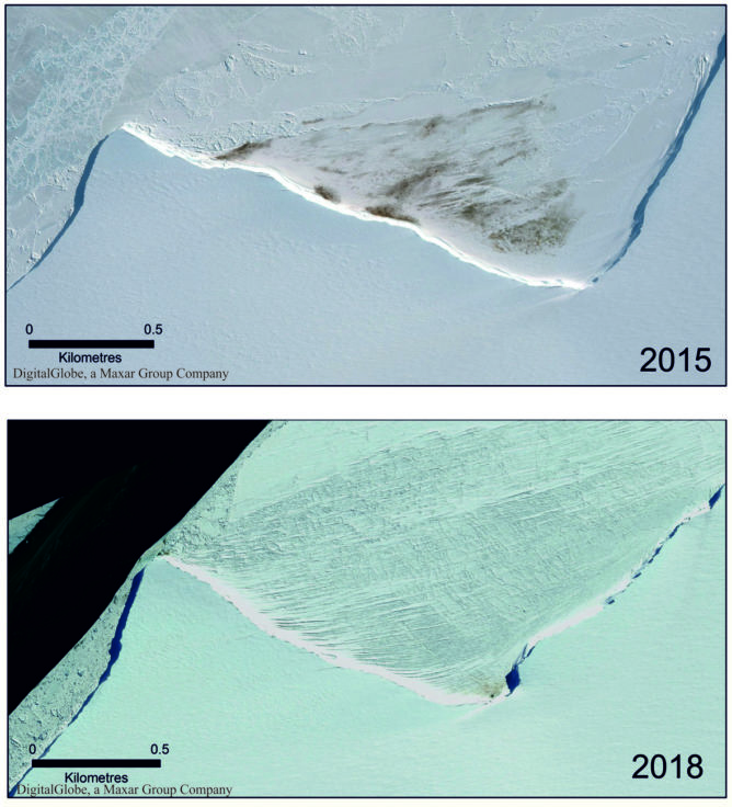 Satellite imagery showing the reduction in size of the Halley Bay colony in 2018 compared with 2015